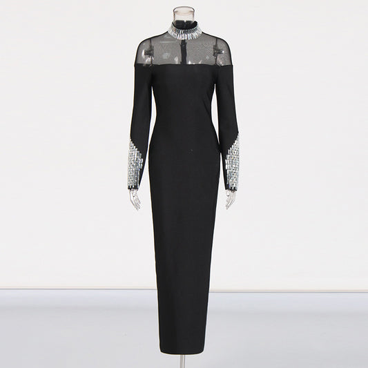 Fashionable and sexy round neck mesh splicing with diamond studded design slimming and elongated dress