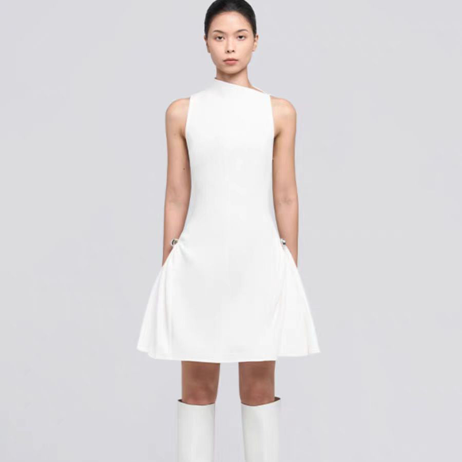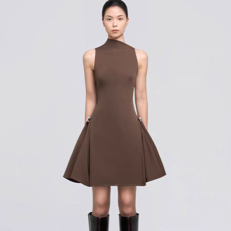 Metal buckle symmetrical pleated sleeveless short skirt with waist cinching dress